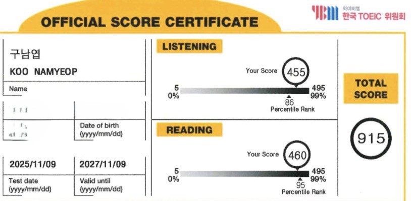 7¿ù¿¡ ¼ö°À» ½ÃÀÛÇØ 11¿ù±îÁö °øºÎÇÑ °á°ú, 915Á¡À̶ó´Â Á¡¼ö¸¦ ¹ÞÀ» ¼ö ÀÖ¾ú½À´Ï´Ù.